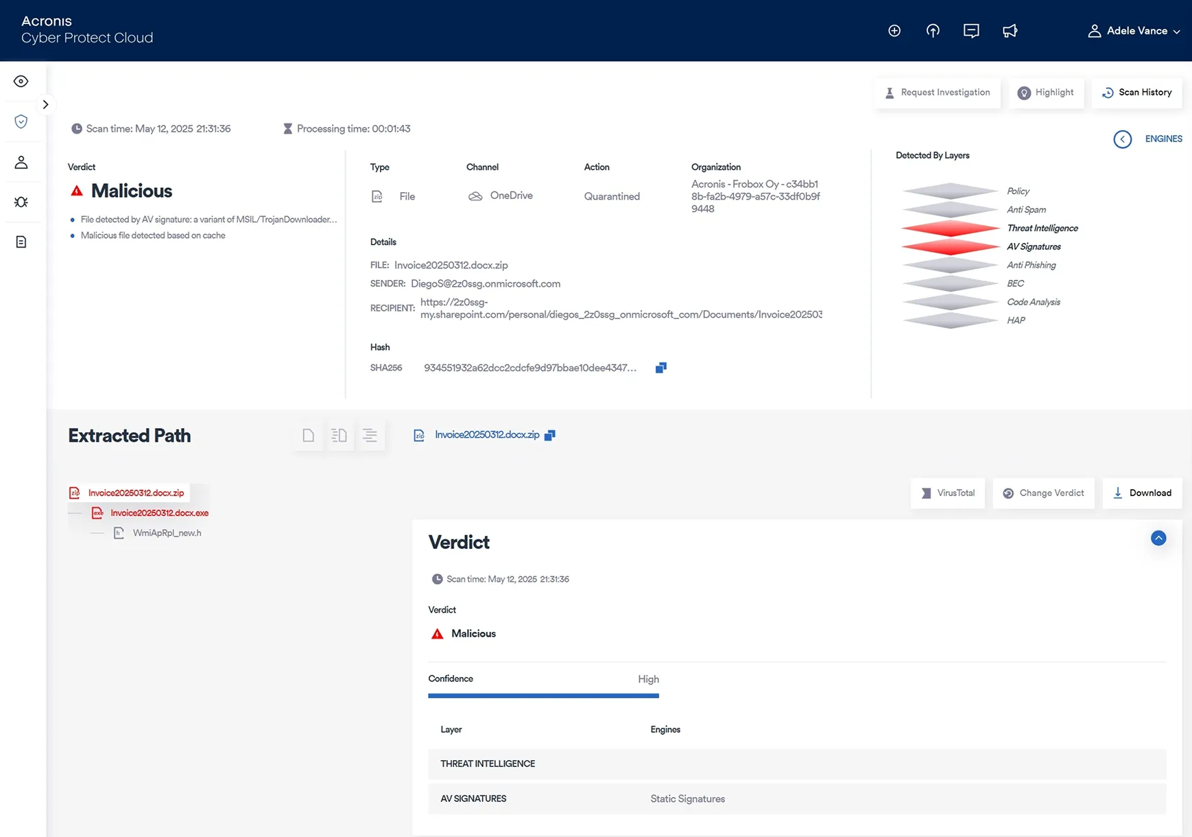 Acronis alerta a los equipos cuando se detecta contenido malicioso y evita que la amenaza se propague a los usuarios finales mediante el análisis dinámico de cada archivo y URL en busca de amenazas relacionadas con el contenido como: