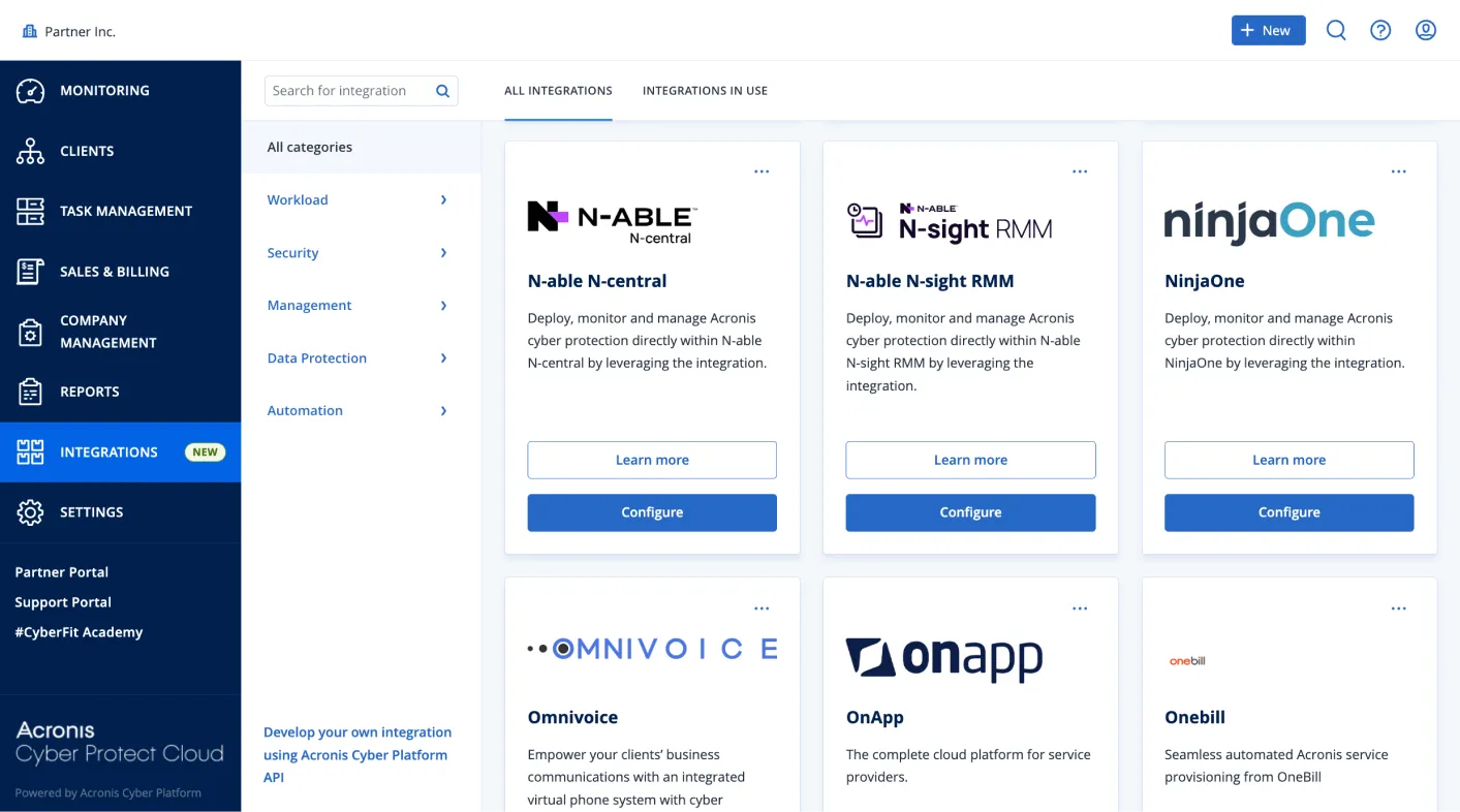 Logre sinergias a través de integraciones nativas entre Acronis PSA y protección de datos, ciberseguridad y RMM.